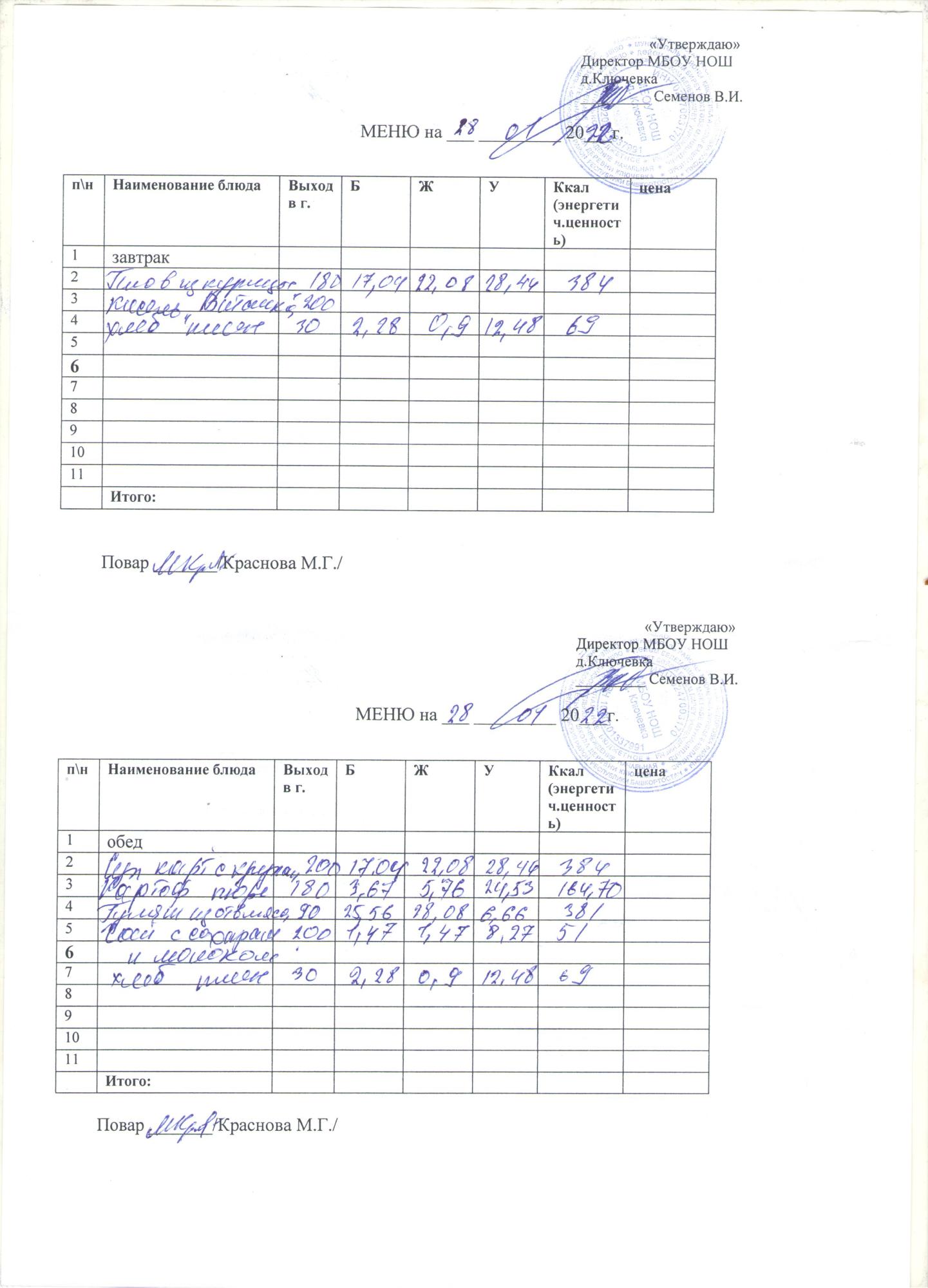 меню на 28 января