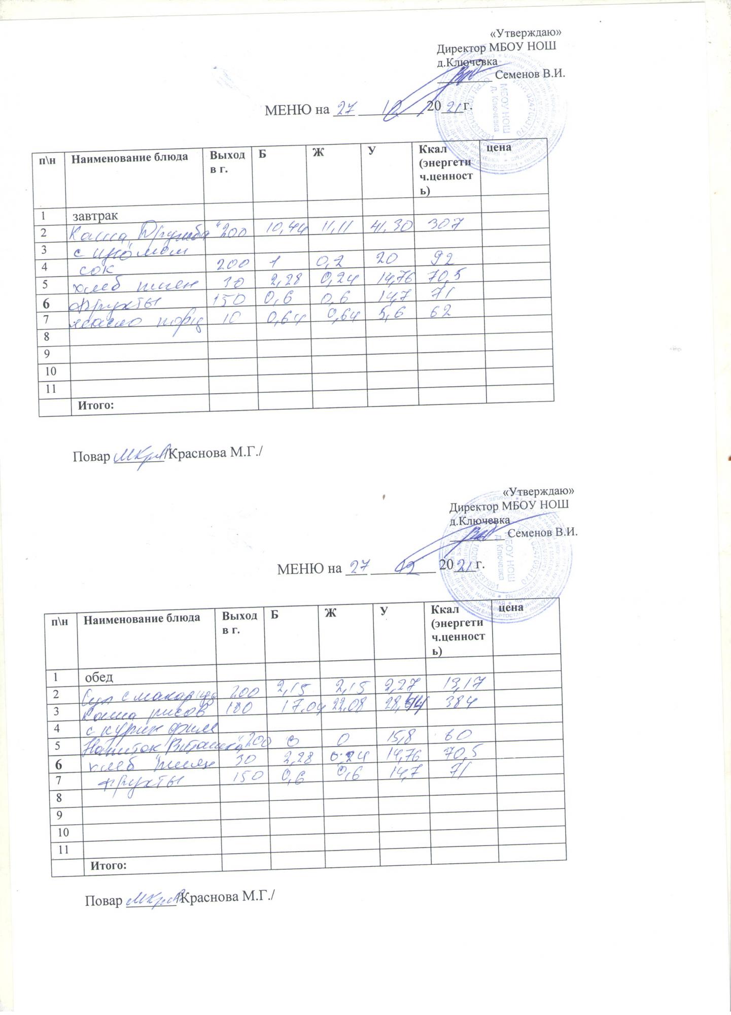 меню на 27 января