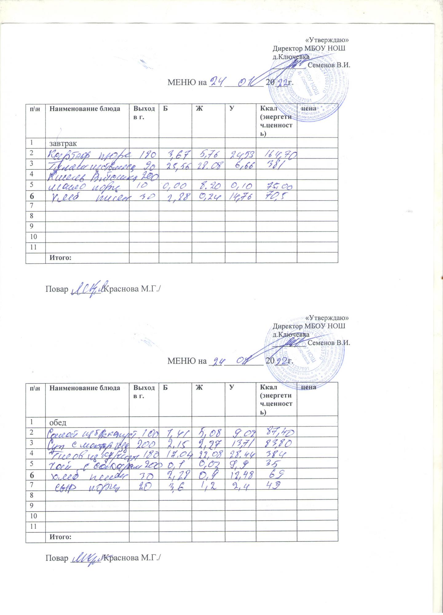 меню на 24 января