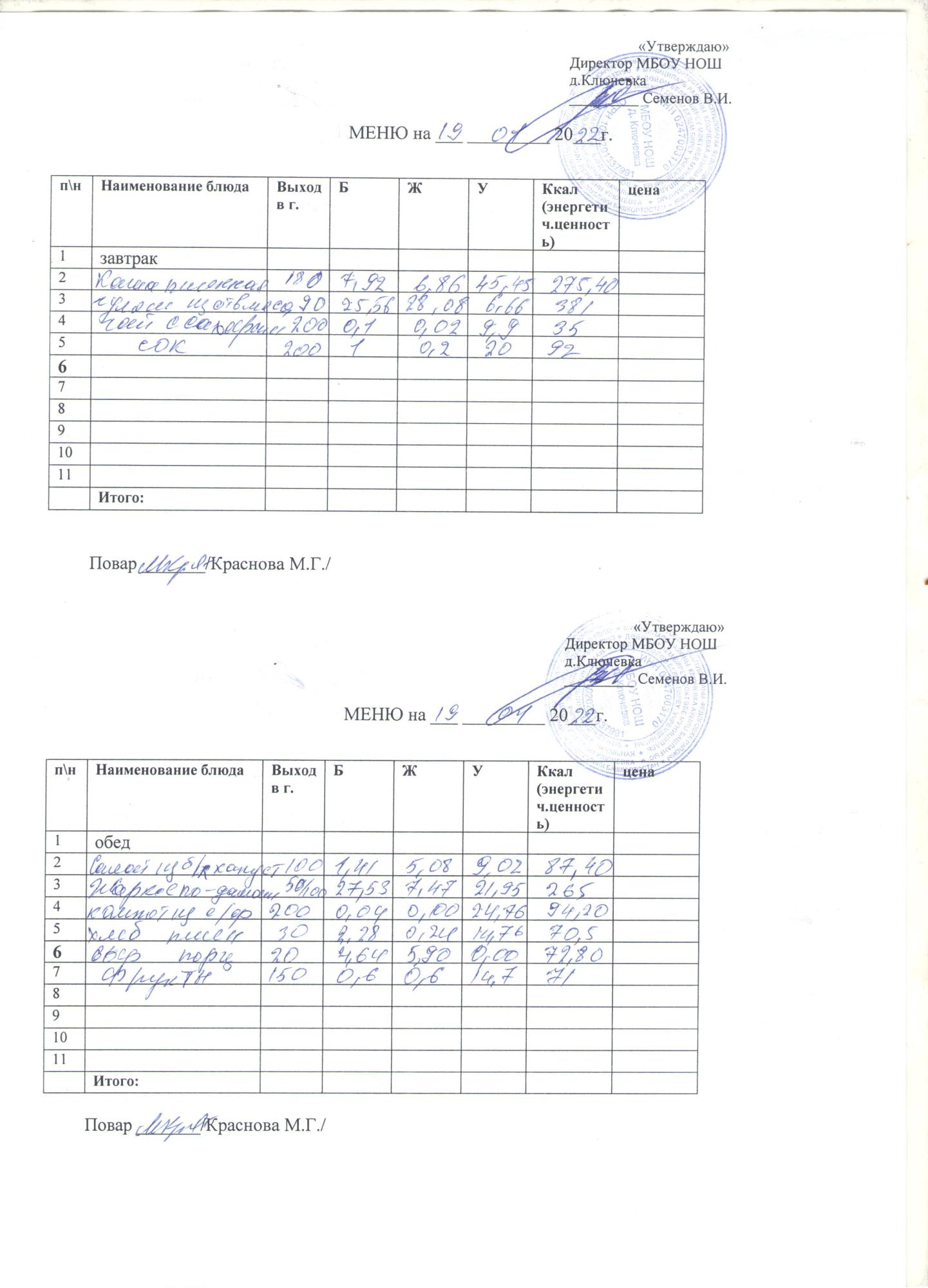 меню на 19 января