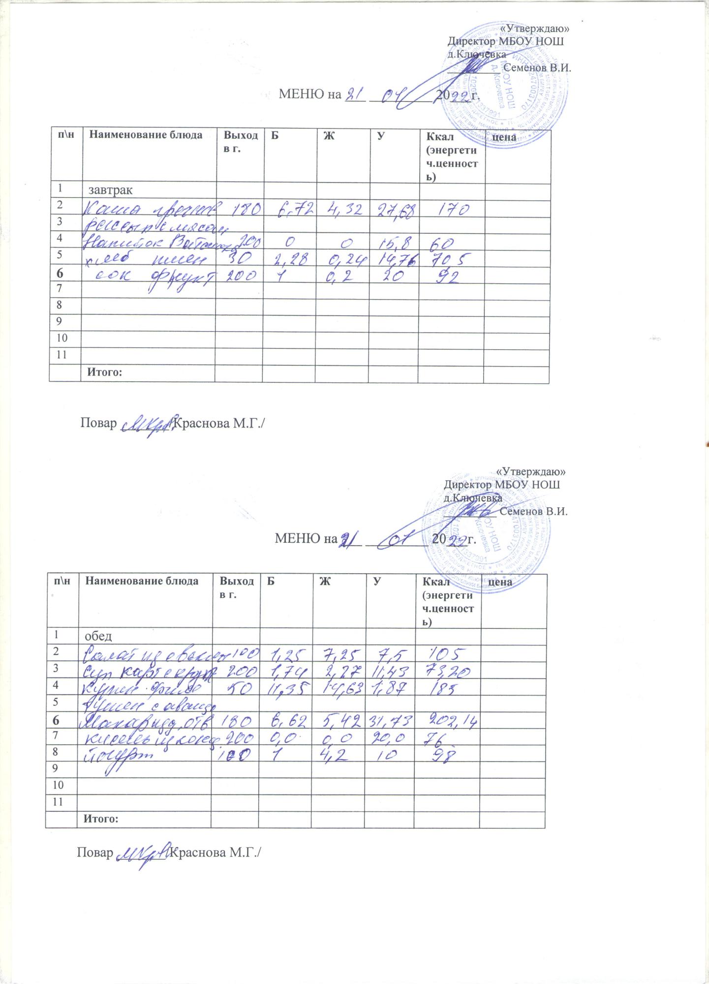 меню на 21 января