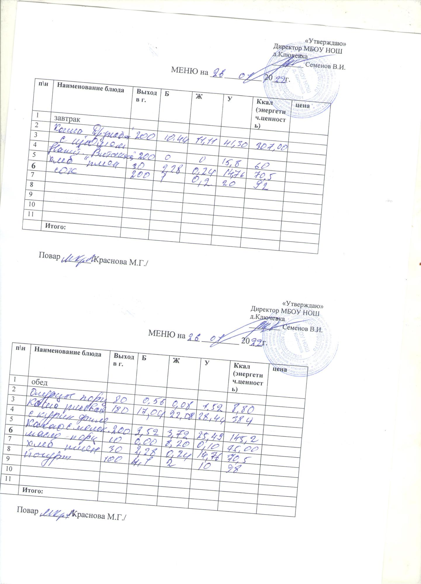 меню на 26 января
