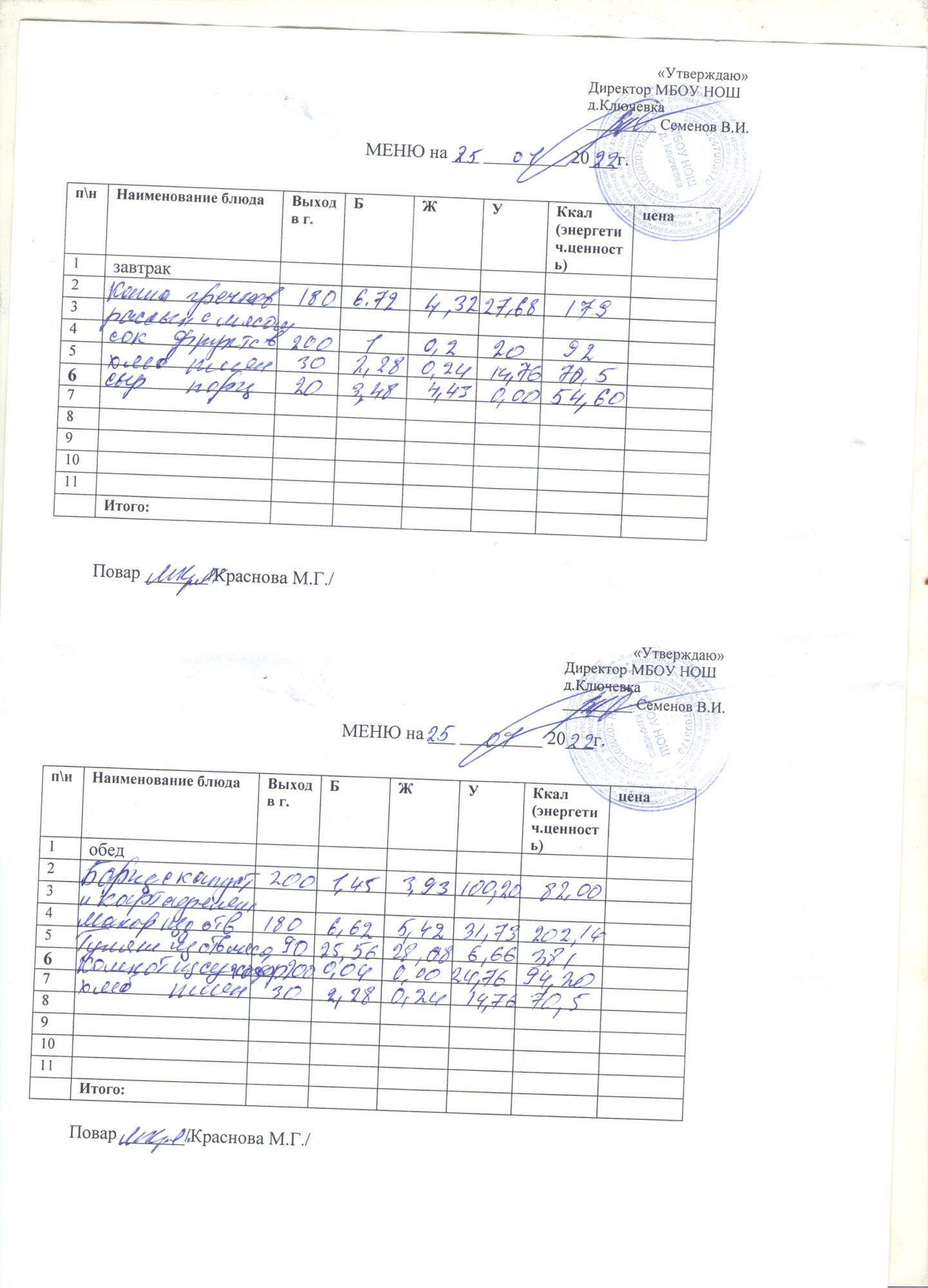 меню на 25 января